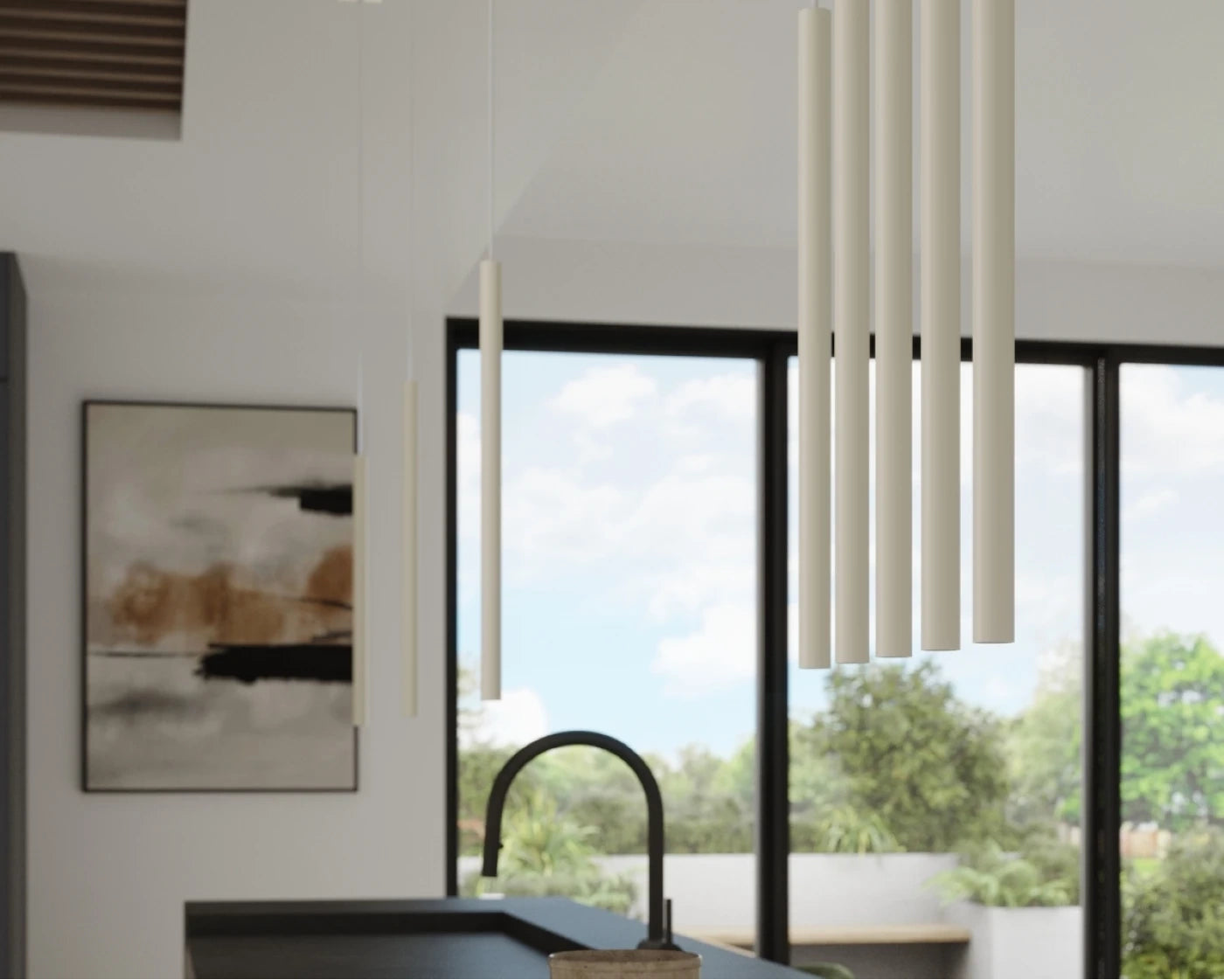 Über der Kücheninsel werden Pendelleuchten zum zentralen Gestaltungselement. Sie gliedern den Raum, setzen architektonische Akzente und schaffen warmes, gerichtetes Licht für Arbeit und Genuss zugleich.
