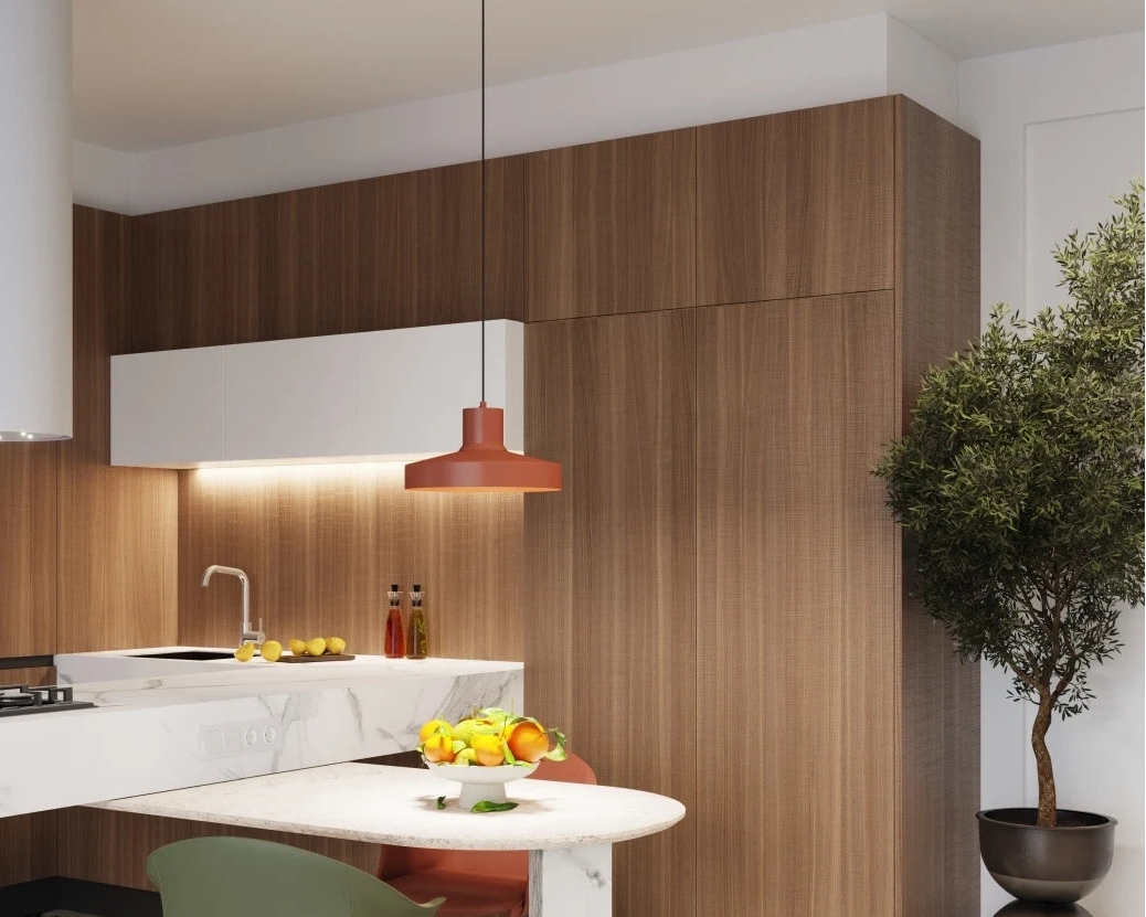 In Kombination mit Pendelleuchten über der Kücheninsel entsteht eine moderne Lichtarchitektur, die Funktion und Atmosphäre vereint. So wird die Küche nicht nur Arbeitsraum, sondern ein Ort des Designs und des Wohlfühlens.