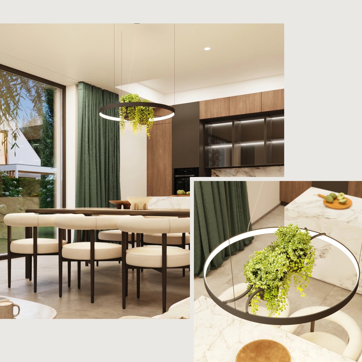 Der RIO BIO Kronleuchter verbindet einen großzügigen, geometrischen LED-Ring mit einem offenen Innenraum, der Platz für eigene Pflanzen oder dekorative Elemente bietet. Je nach gewählter Lichtfarbe taucht der ringförmige Aluminiumkörper den Raum in warmes oder neutrales Licht. Das klare Design schafft eine harmonische Atmosphäre und unterstützt individuelle Gestaltungsmöglichkeiten in modernen Interieurs.